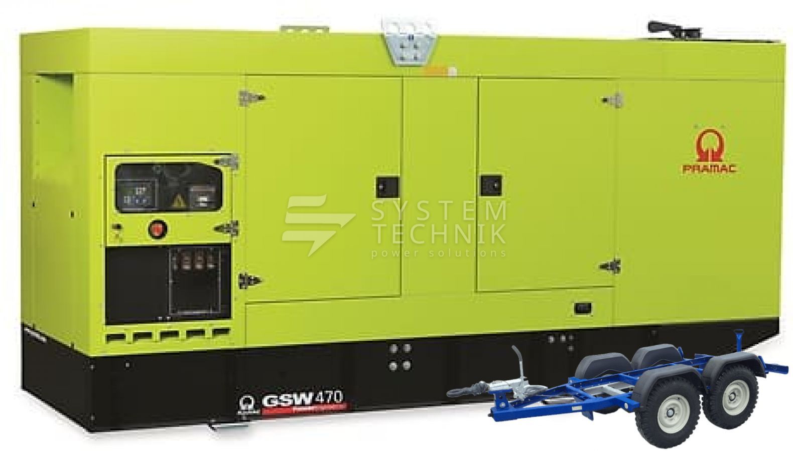 - Дизельный генератор Pramac GSW 470 P 400V В кожухе на прицепе